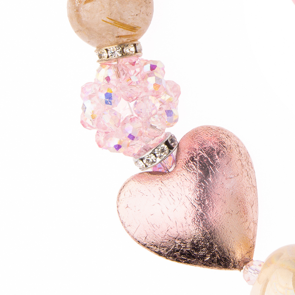 Náhrdelník s dĺžkou 54 cm tvorí harmonická kompozícia korálok zo skla, dreva, keramiky, ruženínu a živice v jemných ružových odtieňoch. Dominantu šperku tvorí luxusné srdce z dreva s krásne lesknúcim sa povrchom, potiahnuté tenkou vrstvou v kombinácii s ružovým zlatom. Navyše ho dopĺňa jemná pletená ozdoba z fazetovaných sklenených kryštálikov, ktorá mu dodáva elegantný lesk a noblesný detail. V náhrdelníku je srdce umiestnené asymetricky, čím ešte viac vyniká a pôsobí moderne. Napokon klasické jednoduché zapínanie v poródiovanom striebre zabezpečuje pohodlné a bezpečné nosenie.