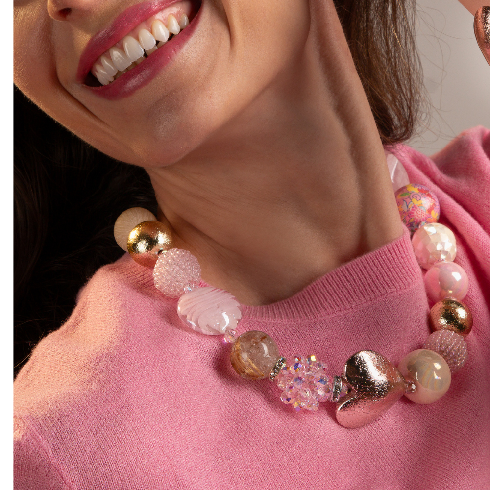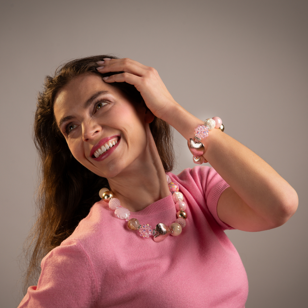 Ružové odtiene korálok dodávajú šperkom elegantnú jemnosť, zatiaľ čo ich veľkosť zabezpečuje opticky masívny a zapamätateľný vzhľad. Vďaka tomu dokáže náhrdelník a náramok Summer so srdcom ružový okamžite pritiahnuť pozornosť a nádherne vynikne práve pri jednoduchom oblečení. Výrazný dizajn dokáže premeniť aj minimalistický outfit na štýlovy a nápaditý look.