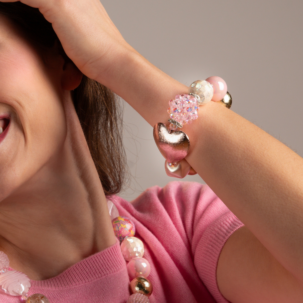 Náhrdelník dopĺňa náramok s dĺžkou 18 cm, ktorý farebne aj veľkostne harmonicky nadväzuje na náhrdelník. Aj tu tvorí rovnaké luxusné srdce pevnú súčasť náramku, čím vzniká dokonale zladený celok. Navlečenie na pružnej gumičke umožňuje jednoduché nasadenie a komfortné nosenie počas celého dňa.