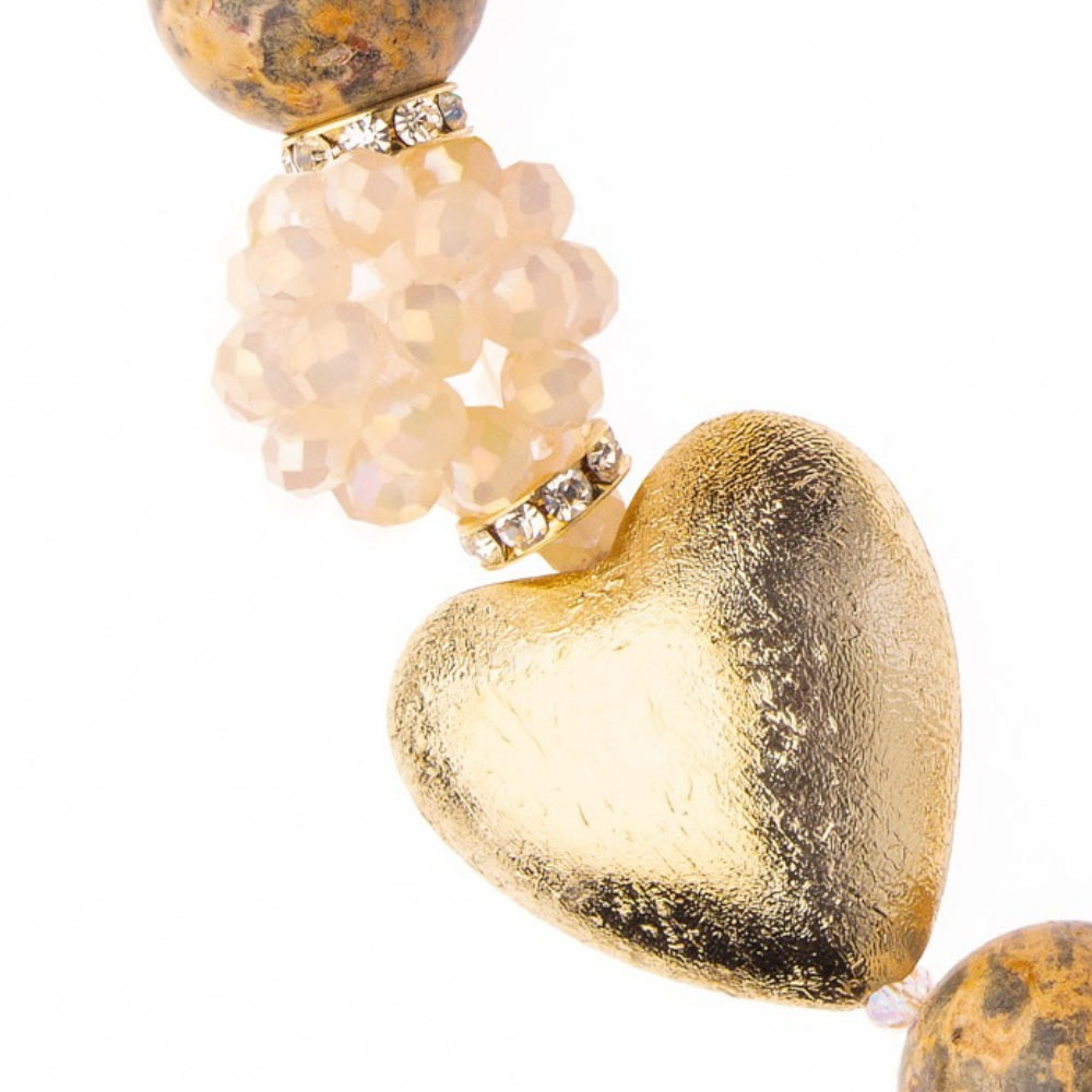 Náhrdelník s dĺžkou 54 cm tvorí harmonická kompozícia korálok zo skla, dreva, keramiky a živice v zlatistých farbách. Dominantu šperku tvorí luxusné srdce z dreva s krásne lesknúcim sa povrchom, potiahnuté tenkou vrstvou v kombinácii so žltým zlatom. Navyše ho dopĺňa jemná pletená ozdoba z fazetovaných sklenených kryštálikov, ktorá mu dodáva elegantný lesk a noblesný detail. V náhrdelníku je srdce umiestnené asymetricky, čím ešte viac vyniká a pôsobí moderne. Napokon klasické jednoduché zapínanie v striebre pozlátené žltým zlatom zabezpečuje pohodlné a bezpečné nosenie.