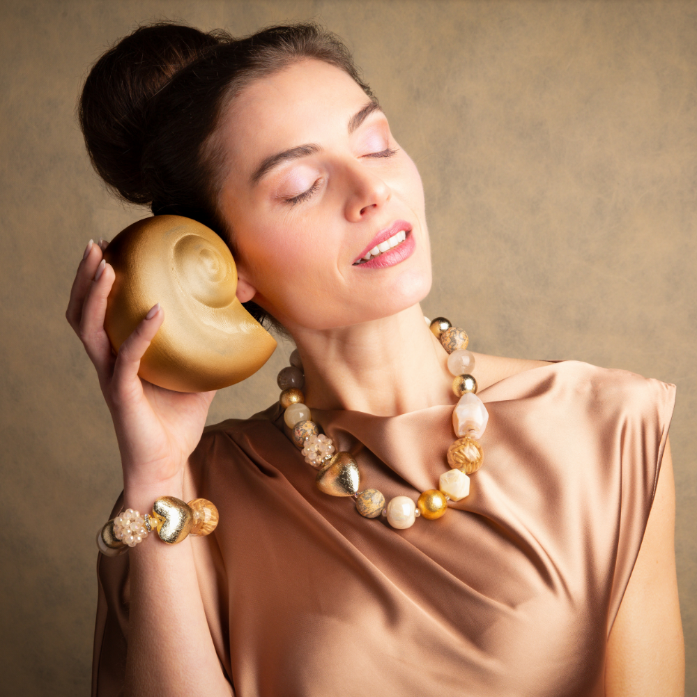Teplé zlaté tóny korálok dodávajú šperkom eleganciu, zatiaľ čo ich veľkosť zabezpečuje opticky masívny a zapamätateľný vzhľad. Vďaka tomu dokáže náhrdelník a náramok Summer so srdcom zlatý okamžite pritiahnuť pozornosť a nádherne vynikne práve pri jednoduchom oblečení. Výrazný dizajn dokáže premeniť aj minimalistický outfit na štýlovy a nápaditý look.