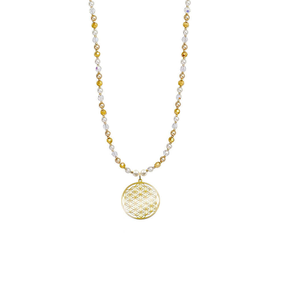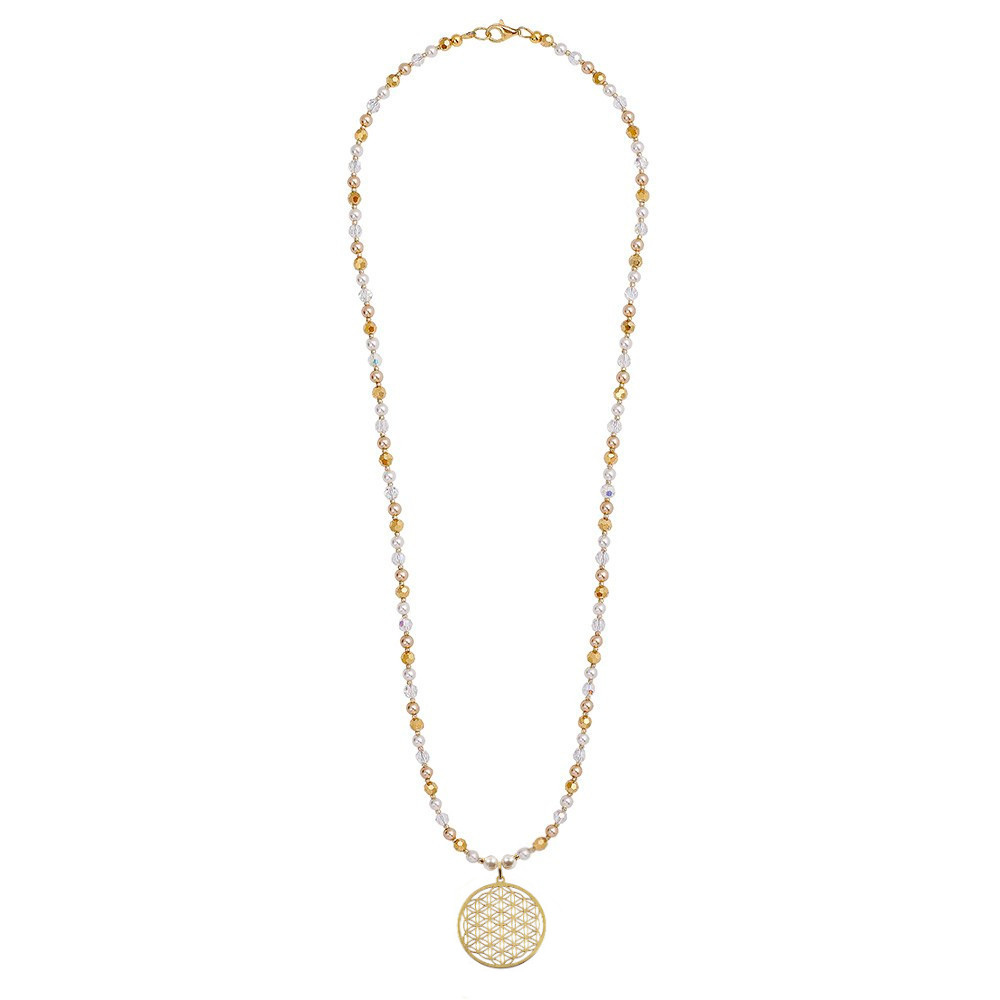 Dlhá retiazka z drobných perál a kryštálikov s dĺžkou 85cm je ukončená veľkým príveskom v tvare kvetu života – symbolom jednoty, stvorenia a prepojenosti všetkého vo vesmíre. Náhrdelník zapnete pomocou malej striebornej karabínky pozlátenej žltým zlatom. Biele a zlaté tóny v jemných perlách a trblietavých kryštálikoch sa dokonale dopĺňajú a vytvárajú harmonický celok, ktorý pôsobí elegantne a zároveň mladistvo.