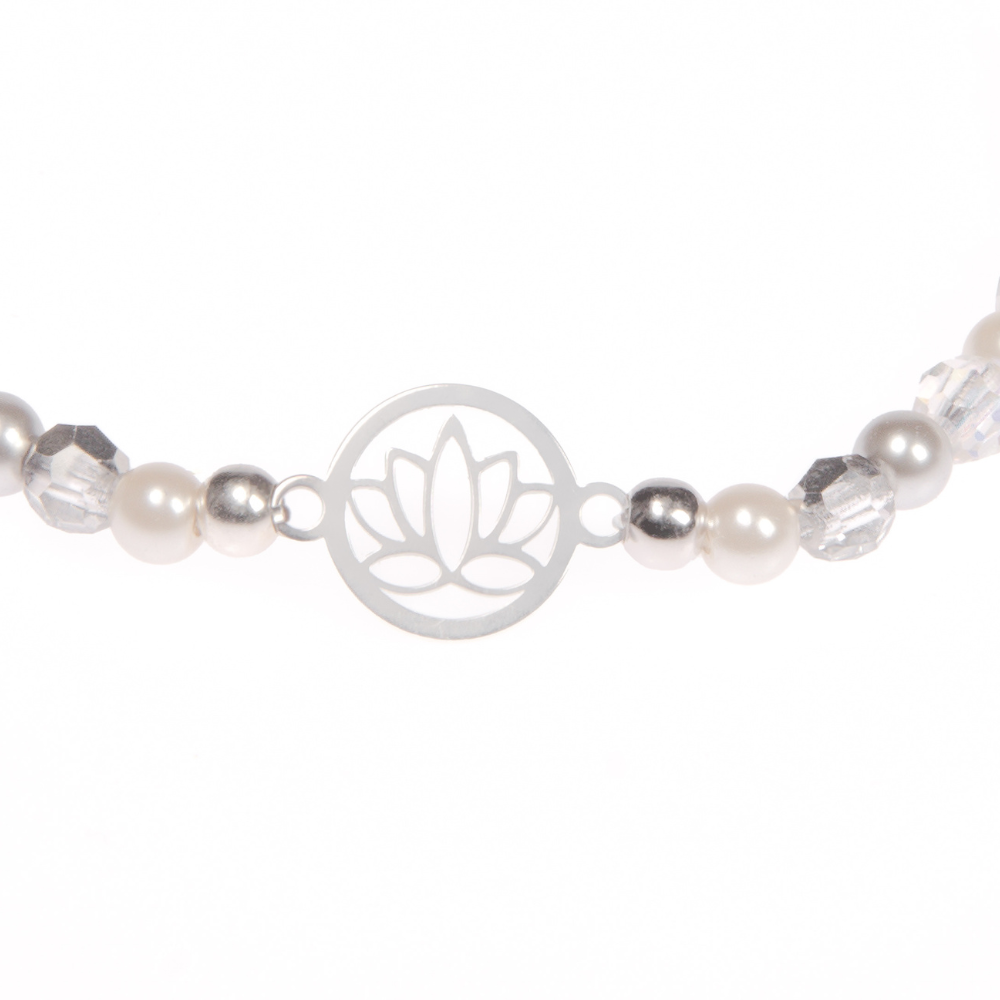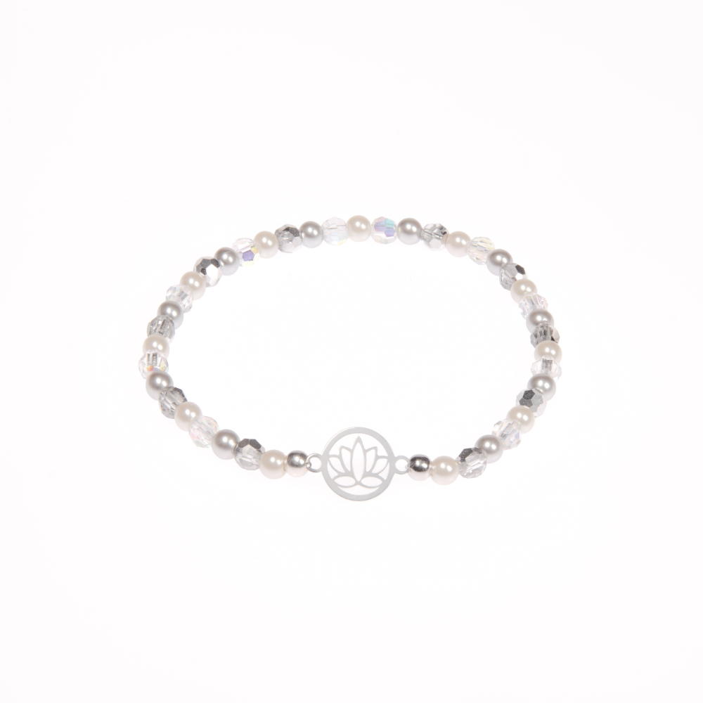 Do stredu náramku sme pridali drobný prívesok v tvare lotosového kvetu v poródiovanom striebre. Jeho jemný strieborný povrch prirodzene ladí s perlovým leskom a spolu vytvárajú sofistikovaný, no veľmi jemný a harmonický celok.