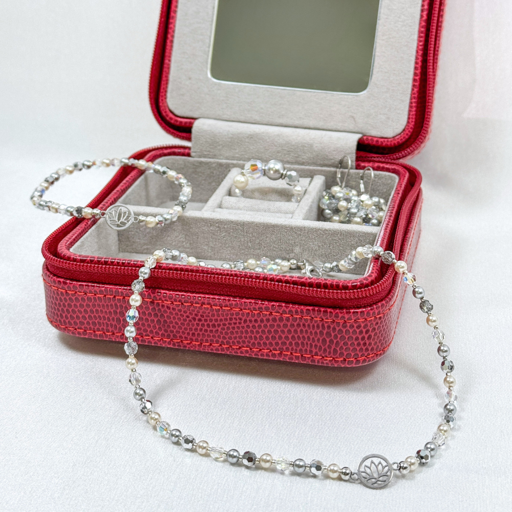 Náramok Amalia lotosový kvet sme ručne vytvorili pre ženy, ktoré si cenia jemnosť, eleganciu a krásu ukrytú v detailoch. Jemné voskované perly v bielej a striebornej farbe sme harmonicky doplnili trblietavými brúsenými kryštálikmi. Tieto pri každom pohybe zachytávajú svetlo a vytvárajú nežný lesk, ktorý zaujme, no zároveň pôsobí subtílne.