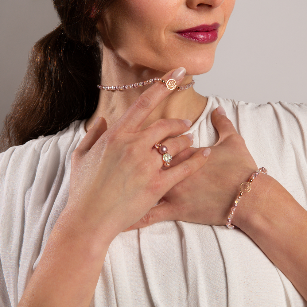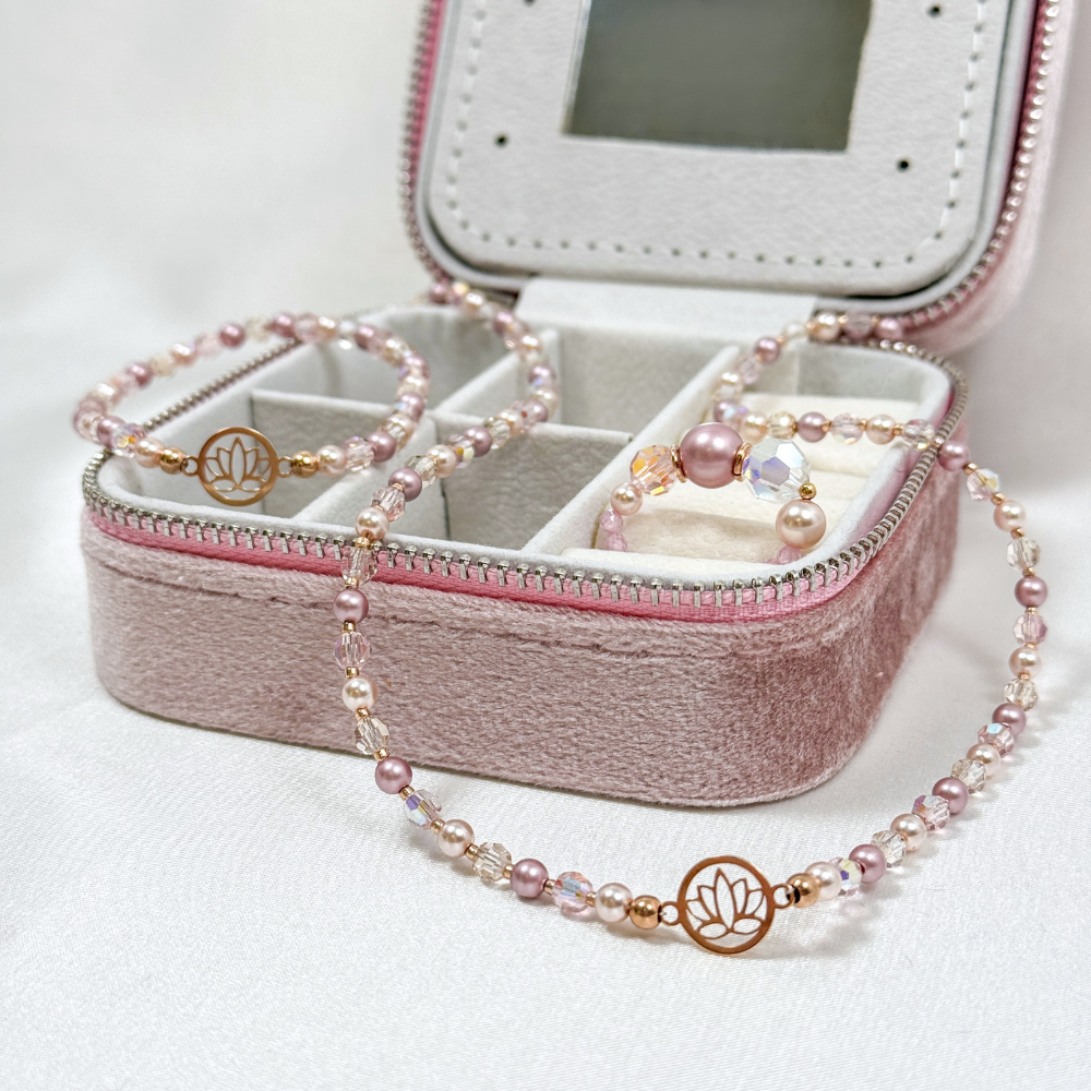 Náramok Amalia lotosový kvet sme ručne vytvorili pre ženy, ktoré si cenia jemnosť, eleganciu a krásu ukrytú v detailoch. Jemné voskované perly v rôznych odtieňoch ružovej sme harmonicky doplnili trblietavými brúsenými kryštálikmi. Tieto pri každom pohybe zachytávajú svetlo a vytvárajú nežný lesk, ktorý zaujme, no zároveň pôsobí subtílne.