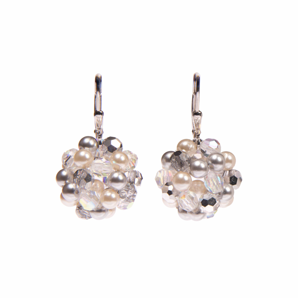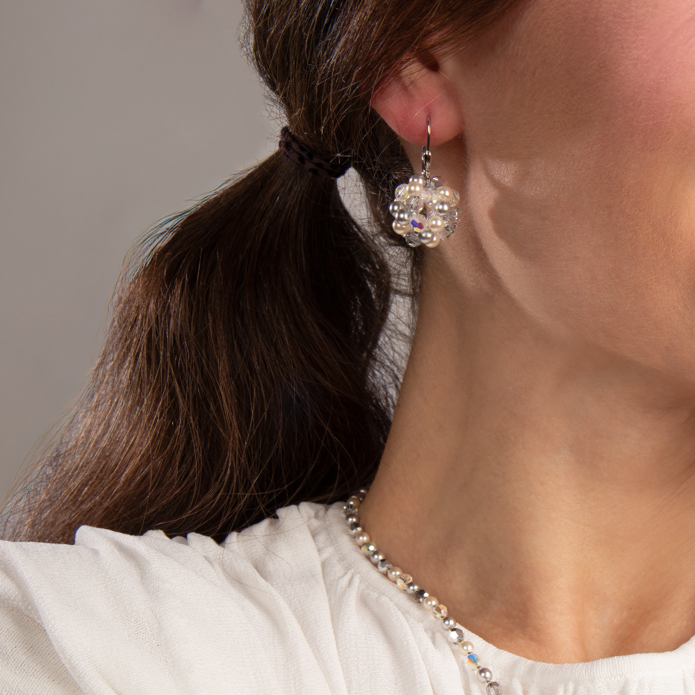 Tieto náušnice sme pre vás vytvorili len z dvoch ušľachtilých materiálov. Guličku sme uplietli z jemných perál a precízne brúsených kryštálikov tradičnej značky Preciosa, ktorá je zavesená na klasický zaklapávací uzáver z poródiovaného striebra.